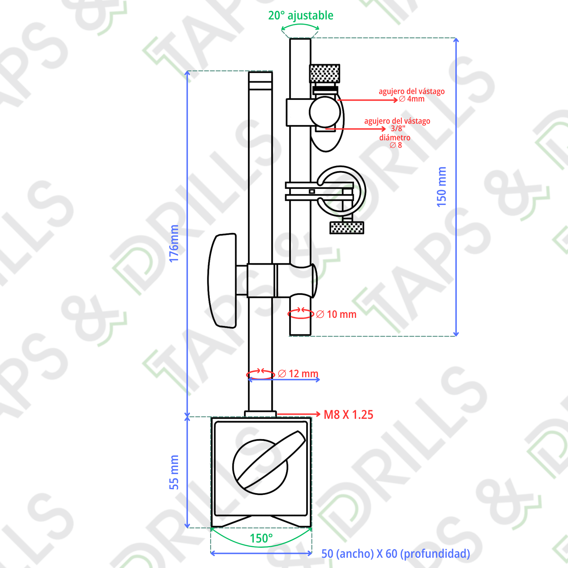 - Vástago de sujeción aplicable 8mm, 4mm, 3/8" diámetro.