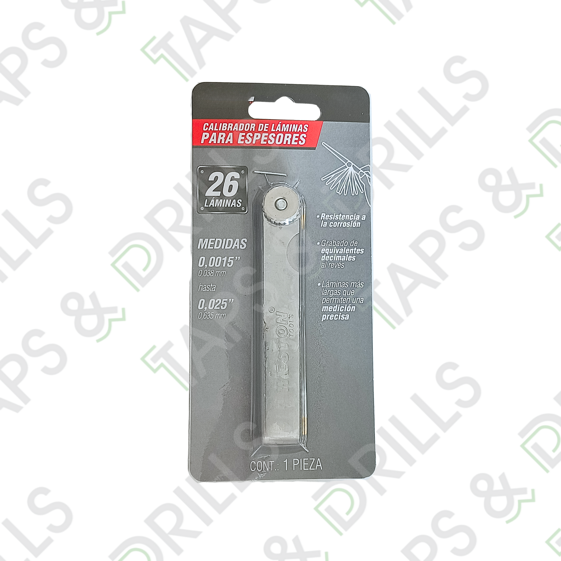 Herramienta de medición que permite verificar el grosor de diferentes materiales. Está compuesto por láminas de acero templado de diferentes espesores.